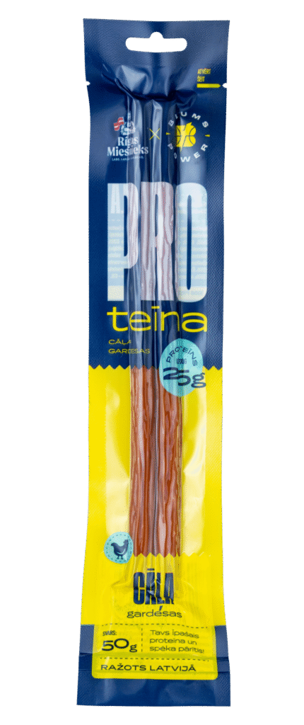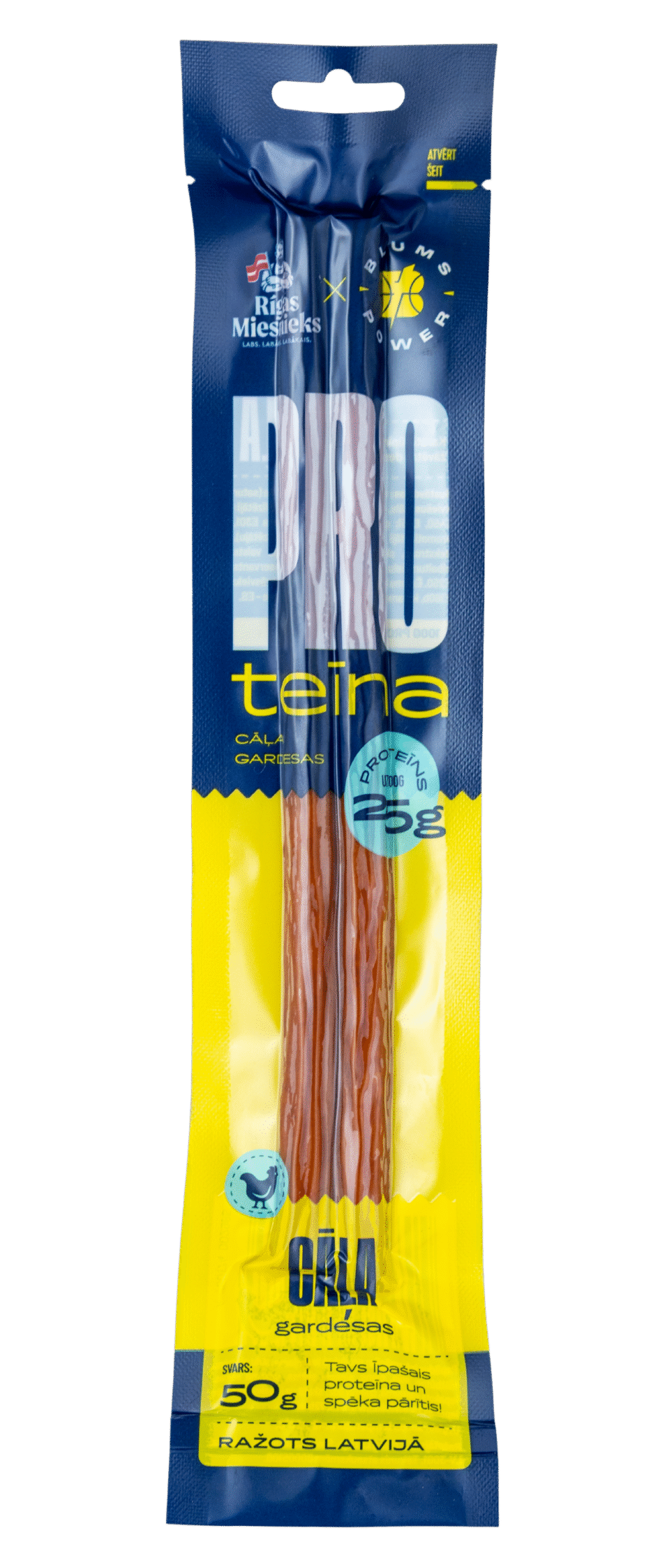 cāļa gaļa 79%, cāļa ādas, rīvmaize (satur kviešus) sāls, garšvielas (satur selerijas), stabilizētāji: E450, E451; garšvielu ekstrakti, antioksidants E301, aromatizētāji (satur kūpināšanas aromatizētāju), dekstroze, skābuma regulētājs E330, augu valsts olbaltumvielu hidrolizāts, krāsviela E120, konservants E250. Ēdams liellopa kolagēna apvalks (satur krāsvielu E160b, karamelizētu cukuru). Izejvielas izcelsme – ES.