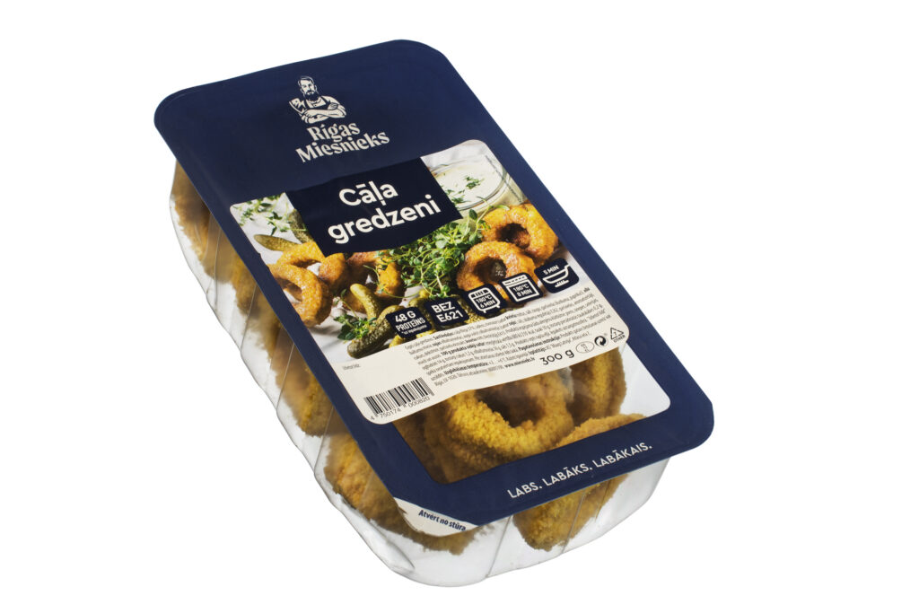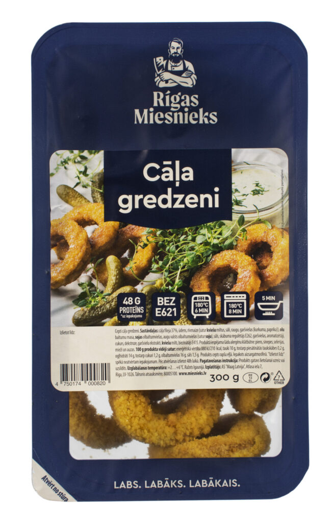 cāļa fileja 37%, ūdens, rīvmaize (satur KVIEŠU miltus, sāli, raugu, garšvielas (kurkuma, paprika)), OLU baltumu masa, SOJAS olbaltumvielas, dārzeņu olbaltumvielas (satur SOJU), sāls, skābuma regulētājs E262, garšvielas, aromatizētāji, cukurs, dekstroze, garšvielu ekstrakti, KVIEŠU milti, biezinātājs E415.