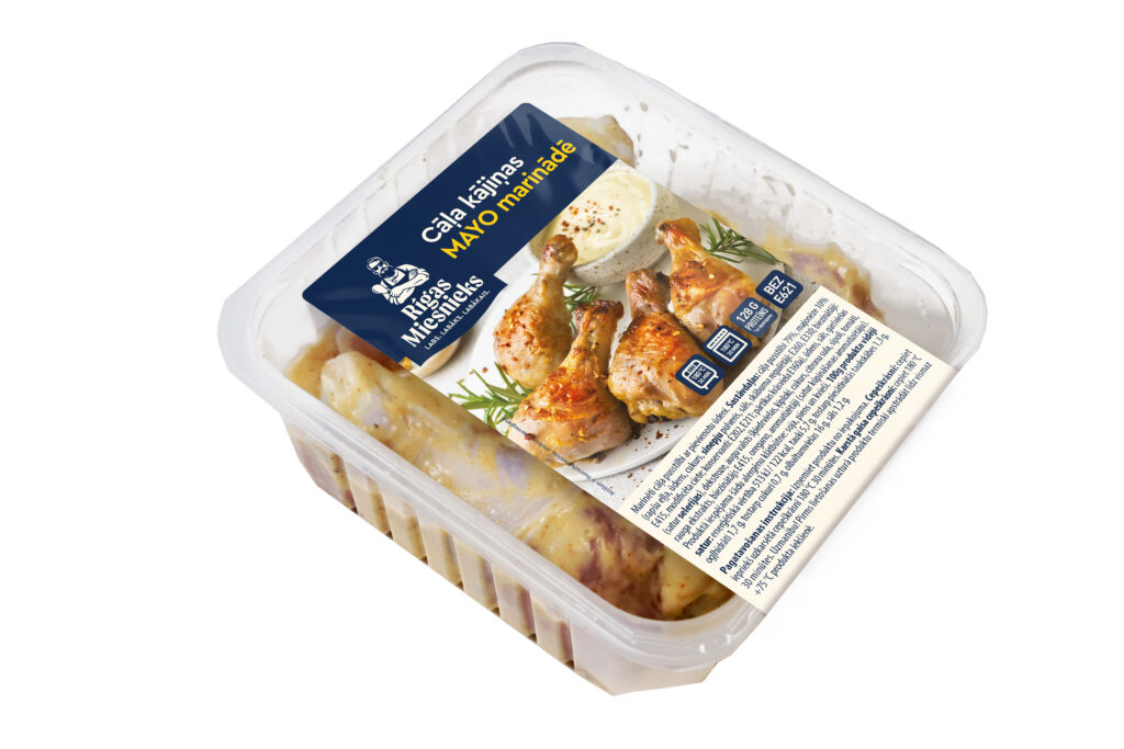 cāļa pusstilbi 79%, majonēze 10% (rapšu eļļa, ūdens, cukurs, sinepju pulveris, sāls, skābuma regulētāji: E260, E330; biezinātāji: E415, modificēta ciete; konservanti: E202, E211; pārtikas krāsviela E160a), ūdens, sāls, garšvielas (satur selerijas), dekstroze, augu valsts šķiedrvielas, ķiploki, cukurs, citronu sula, sīpoli, tomāti, rauga ekstrakts, biezinātājs E415, oregano, aromatizētāji (satur kūpināšanas aromatizētāju).
