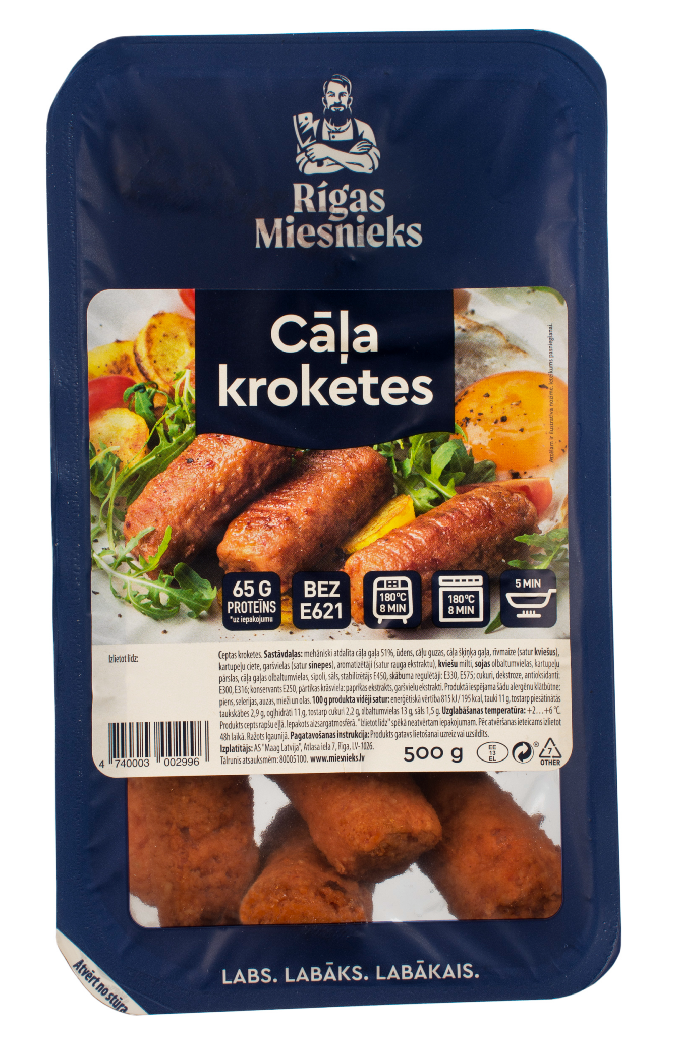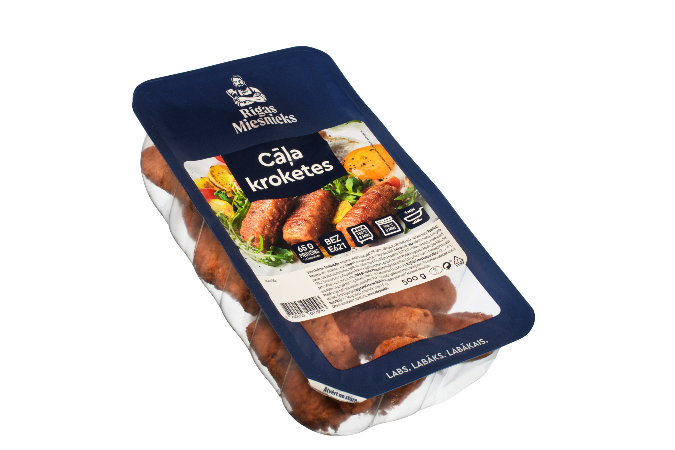 mehāniski atdalīta cāļa gaļa 51%, ūdens, cāļu guzas, cāļa šķiņķa gaļa, rīvmaize (satur KVIEŠUS), ciete, garšvielas (satur SINEPES), aromatizētāji (satur rauga ekstraktu), kviešu milti, SOJAS olbaltumvielas, kartupeļu pārslas, cāļa gaļas olbaltumvielas, sīpoli, sāls, stabilizētājs E450, skābuma regulētāji: E330, E575; cukuri, dekstroze, antioksidanti: E300, E316; konservants E250, pārtikas krāsviela paprikas ekstrakts, garšvielu ekstrakti.