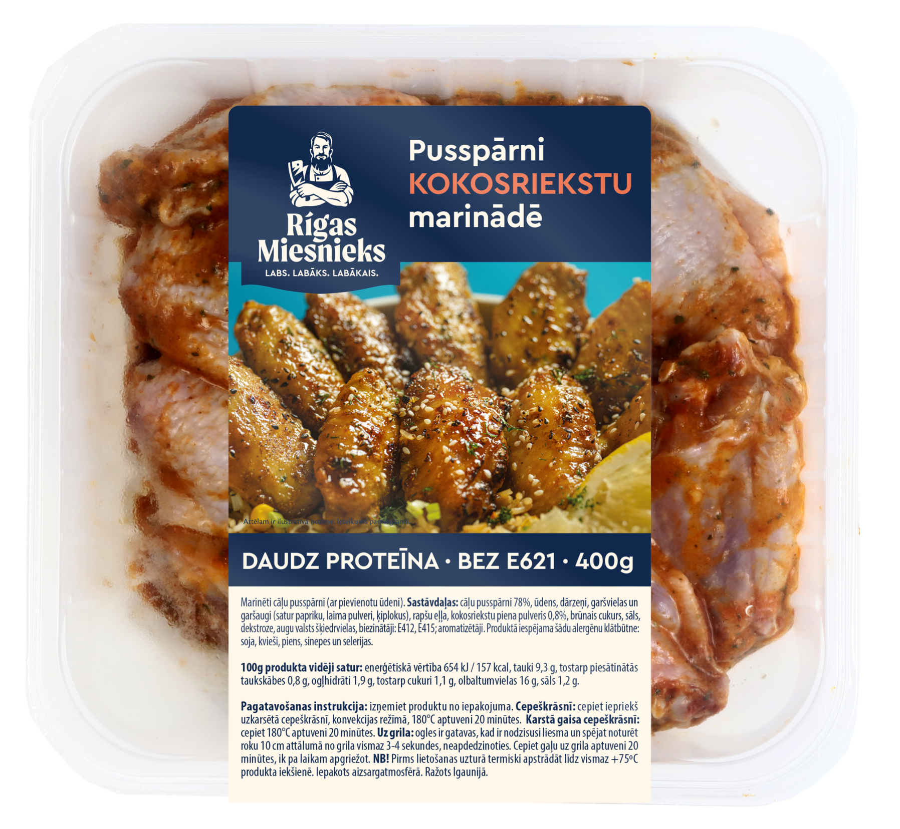 cāļu pusspārni 78%, ūdens, dārzeņi, garšvielas un garšaugi (satur papriku, laima pulveri, ķiplokus), rapšu eļļa, kokosriekstu piena pulveris 0,8%, brūnais cukurs, sāls, dekstroze, augu valsts šķiedrvielas, biezinātāji: E412, E415; aromatizētāji.