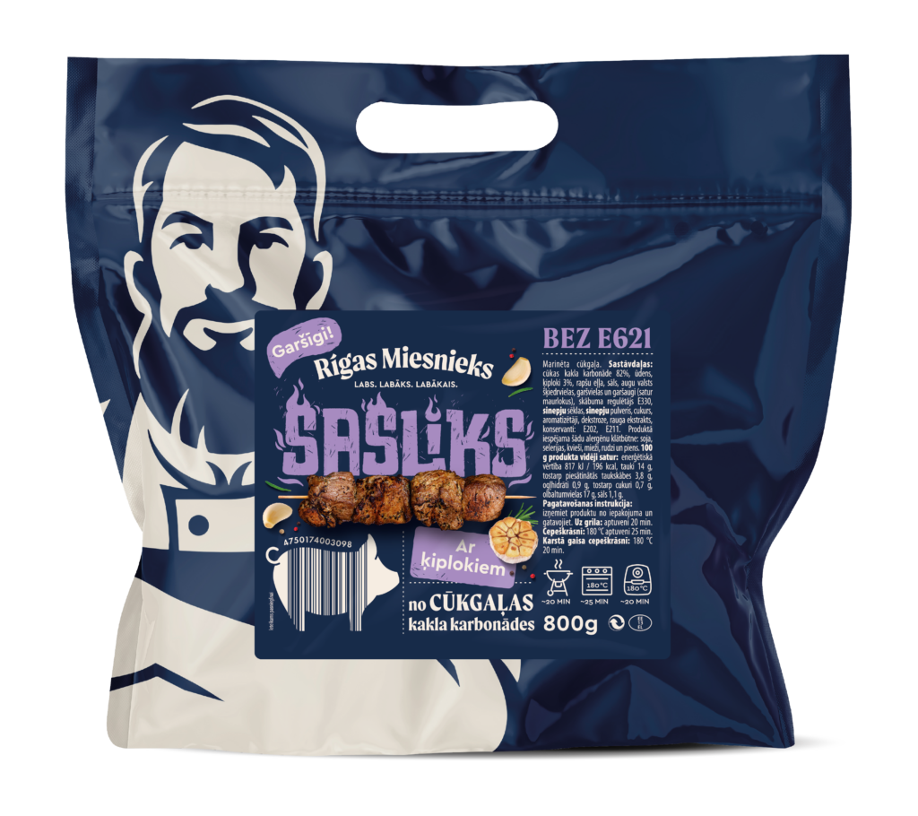 cūkas kakla karbonāde 82%, ūdens, ķiploki 3%, rapšu eļļa, sāls, augu valsts šķiedrvielas, garšvielas un garšaugi (satur maurlokus), skābuma regulētājs E330, sinepju sēklas, sinepju pulveris, cukurs, aromatizētāji, dekstroze, rauga ekstrakts, konservanti: E202, E211. Produktā iespējama šādu alergēnu klātbūtne: soja, selerijas, kvieši, mieži, rudzi un piens.