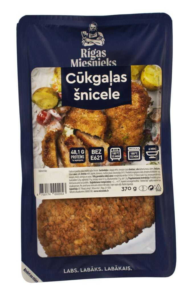 cūkgaļa 44%, rīvmaize (satur KVIEŠUS), OLU baltuma masa, ūdens, KRĒJUMS, Edam SIERS, sāls, KVIEŠU milti, ķiploki, ķimenes, melnie pipari, biezinātājs E415.