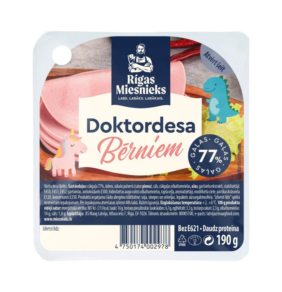 Cūkgaļa 77%, ūdens, sūkalu pulveris (satur pienu), sāls, cūkgaļas olbaltumvielas, olas, garšvielu ekstrakti, stabilizētāji: E450, E451, E452; garšvielas, antioksidants E300, hidrolizētas augu valsts olbaltumvielas, rapšu eļļa, aromatizētāji, modificēta ciete, pārtikas krāsviela E120, konservants E250.