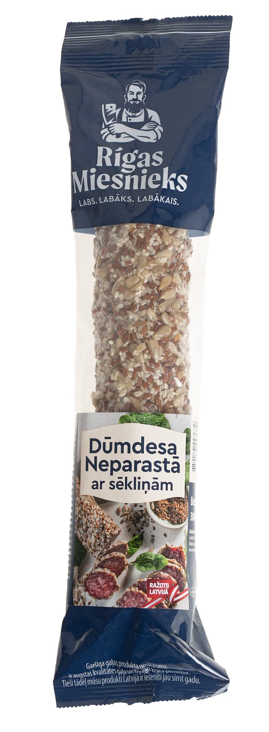 Cūkgaļa (100g produkta pagatavoti no 63g gaļas), cūkgaļas speķis, liellopu gaļa (100g produkta pagatavoti no 20g gaļas), augu valsts olbaltumvielas (satur SOJU), sāls, cūkgaļas hemoglobīns, dekstroze, skābuma regulētājs E575, maltodekstrīns, LAKTOZE, antioksidants E301, aromatizētāji, stabilizētājs E450, krāsviela E120, starta tīrkultūras, konservants E250. Sēkliņu dekors: linsēklas 3%, sezama sēklas 3%, saulespuķu sēklas 3%, želatīns, mitrumuzturētājs glicerīns, antioksidants citronskābe, konservants E202.
