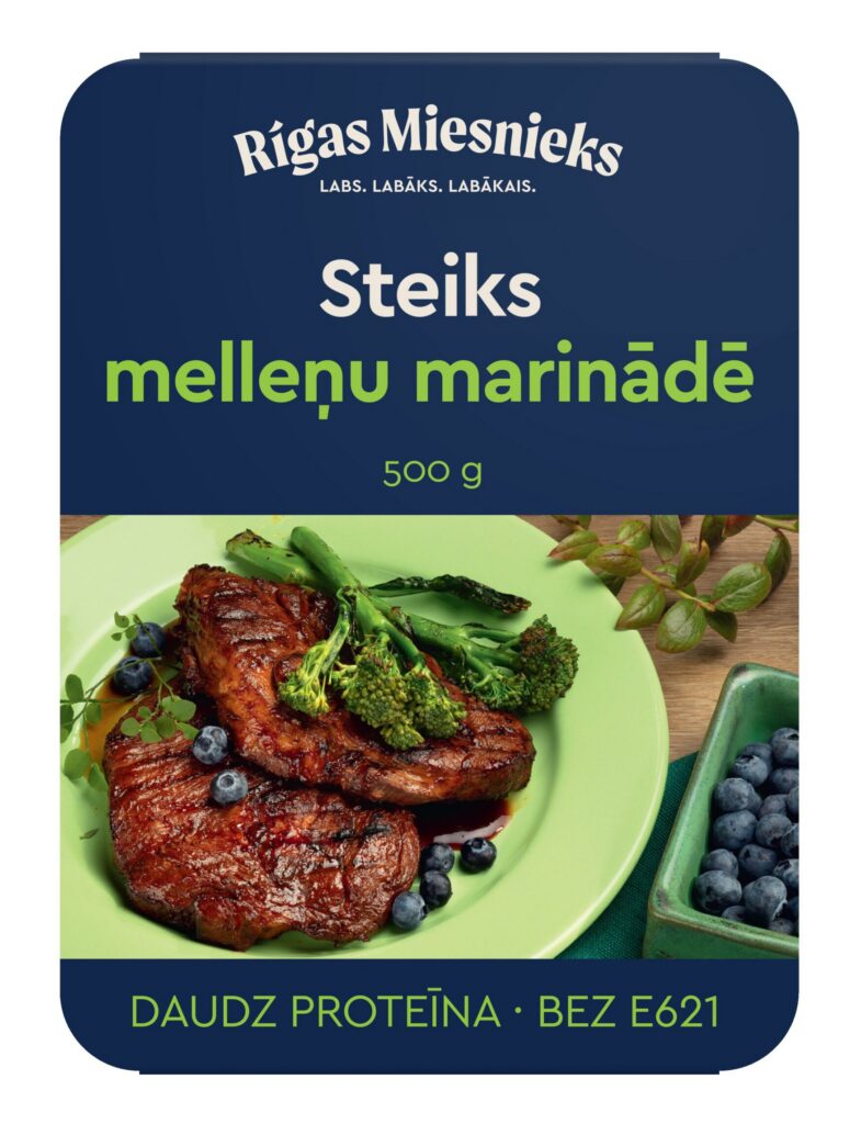cūkas kakla karbonāde 80%, marināde. Marinādes sastāvdaļas: ūdens, melleņu biezenis 6,4%, cukurs, rapšu eļļa, sāls, garšaugi, garšvielas (satur papriku), aromatizētāji (satur rauga ekstraktu, kūpināšanas aromatizētāju, sinepes), modificēta kukurūzas ciete, pārtikas krāsvielas: karamele, paprikas ekstrakts, sarkano biešu koncentrāta ekstrakts; skābuma regulētājs E330, biezinātāji: E412, E415; konservanti: E202, E211.