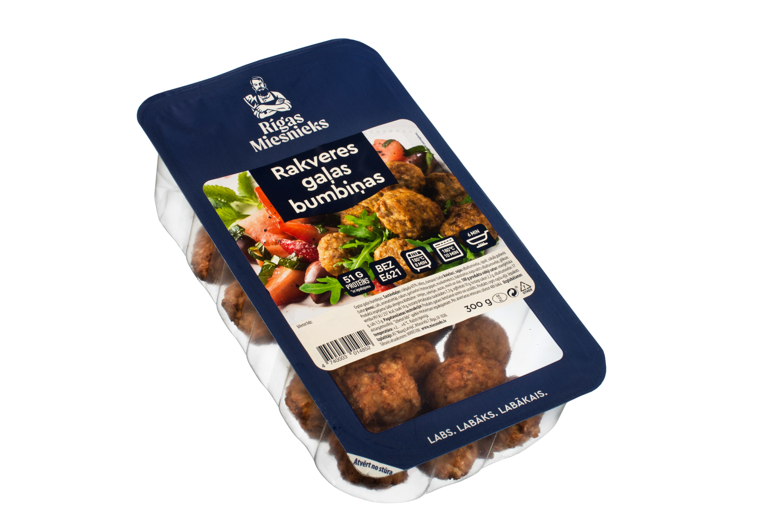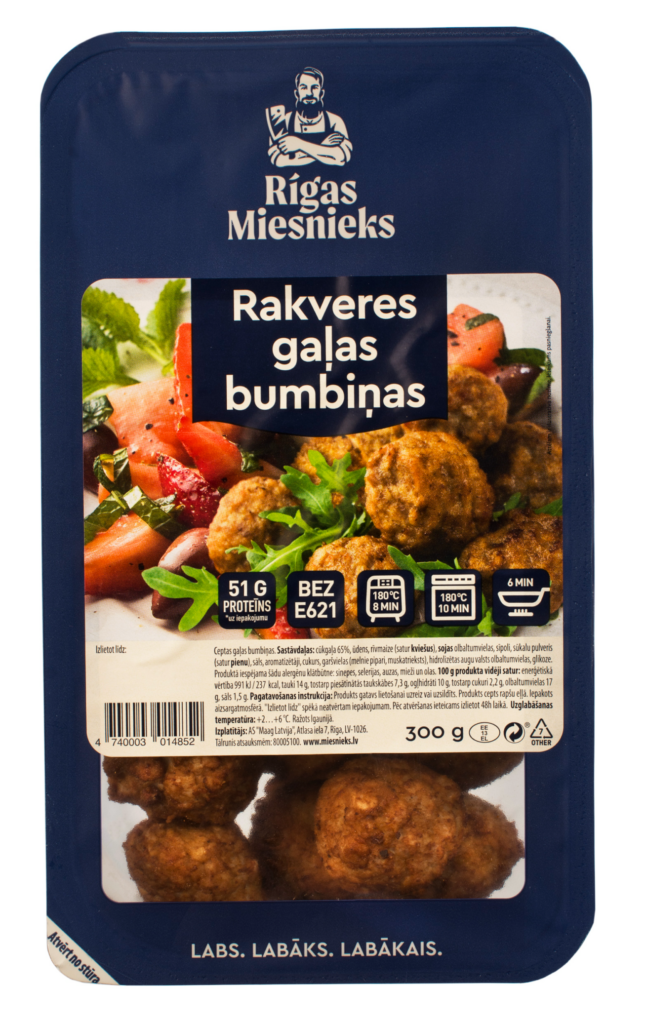 cūkgaļa 65%, ūdens, rīvmaize (satur KVIEŠUS), SOJAS olbaltumvielas, sīpoli, sūkalu pulveris (satur PIENU), sāls, aromatizētāji, cukurs, garšvielas (melnie pipari, muskatrieksts), hidrolizētas augu valsts olbaltumvielas, glikoze.