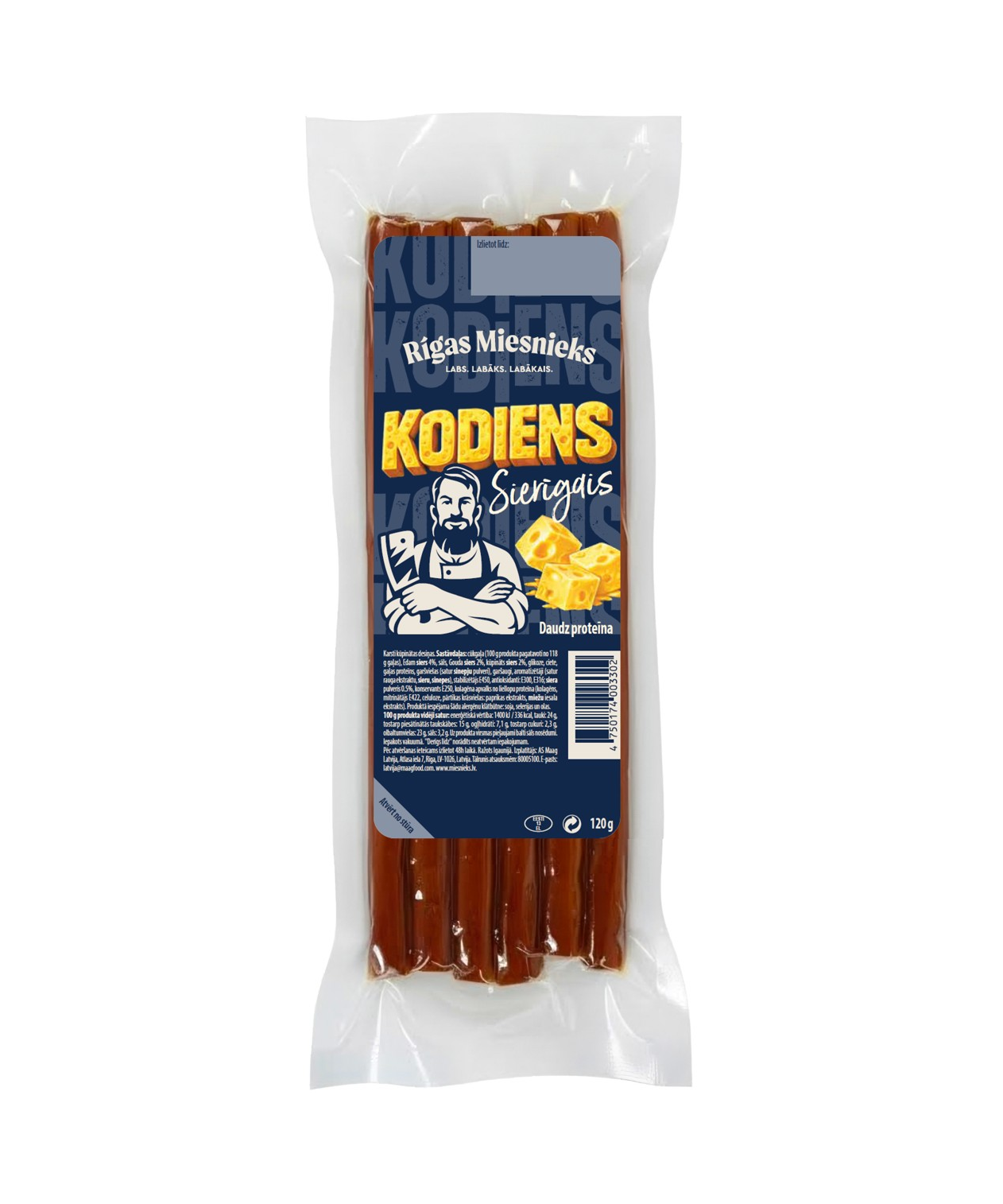 Cūkgaļa (100 g produkta pagatavoti no 118 g gaļas), Edam siers 4%, sāls, Gouda siers 2%, kūpināts siers 2%, glikoze, ciete, gaļas proteīns, garšvielas (satur sinepju pulveri), garšaugi, aromatizētāji (satur rauga ekstraktu, sieru, sinepes), stabilizētājs E450, antioksidanti: E300, E316; siera pulveris 0.5%, konservants E250, kolagēna apvalks no liellopu proteīna (kolagēns, mitrinātājs E422, celuloze, pārtikas krāsvielas: paprikas ekstrakts, miežu iesala ekstrakts).
